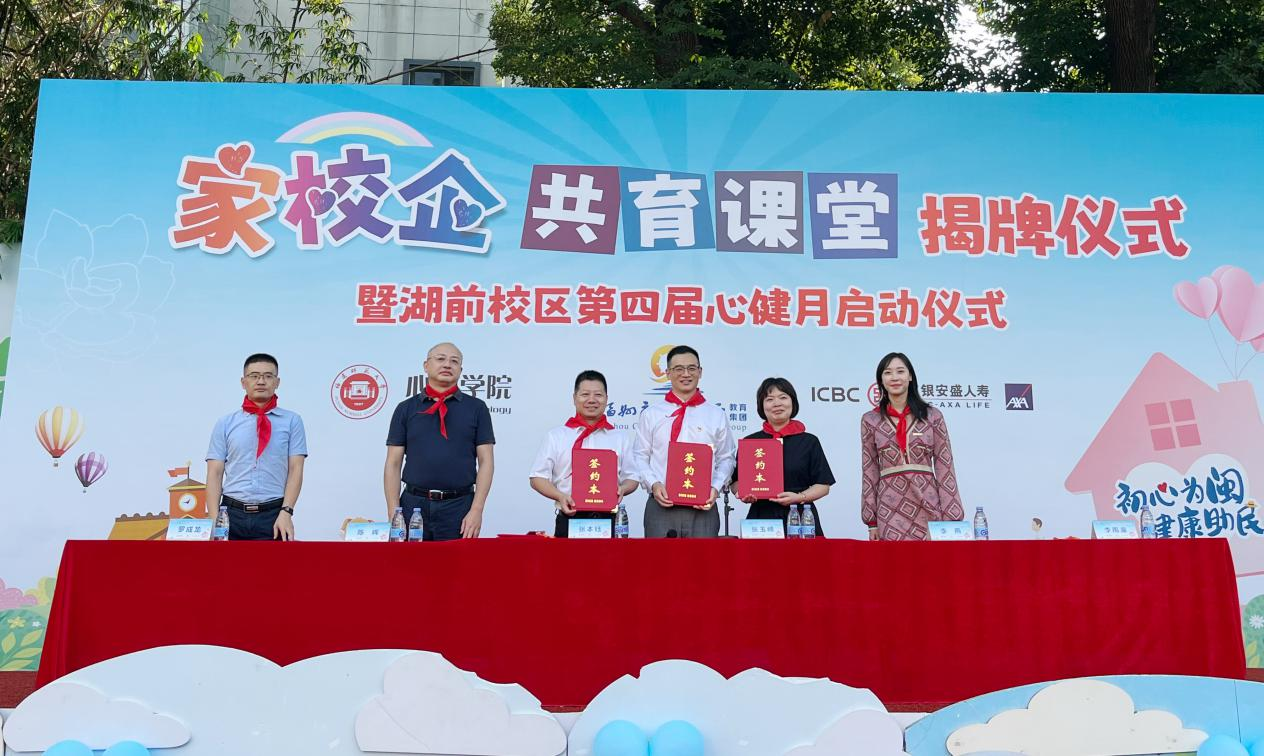 启动仪式上,张本钰、张玉峰、李燕分别作为福建师范大学心理学院、工银安盛人寿福建分公司、福州市钱塘小学教育集团湖前校区三方代表进行家校企协同心理育人项目签约,并共同为本次项目揭牌。